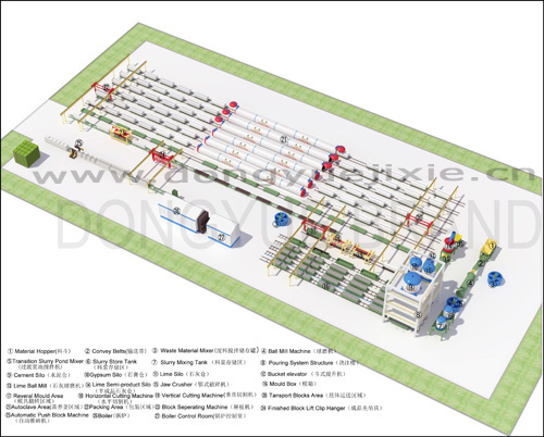 東岳機械股份有限公司是生產(chǎn)加氣混凝土設(shè)備,免燒磚機,加氣混凝土生產(chǎn)線等制品的廠家。集多年的混凝土制品機械制造經(jīng)驗,在廣泛吸收國內(nèi)外設(shè)備優(yōu)點的基礎(chǔ)上,經(jīng)技術(shù)革新,在多方面作以大量改進(jìn)優(yōu)化,我公司設(shè)計的20萬立方加氣混凝土生產(chǎn)線,已達(dá)到國內(nèi)同類設(shè)備水平,所生產(chǎn)加氣混凝土砌塊抗壓強度可達(dá)到5.0-7.5級,收縮值小于0.8mm/m,其質(zhì)量高、重量輕、抗?jié)B性好、隔音、隔熱、保溫、抗震性能優(yōu)良,外形尺寸精確,其破損率低。下面是我公司生產(chǎn)的20萬立方加氣混凝土生產(chǎn)線生產(chǎn)流程及相關(guān)設(shè)備介紹。
